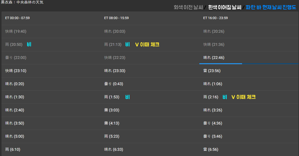 예시) 날씨 바뀌는 시간 et 00:00- 마물 등장 et 02:17