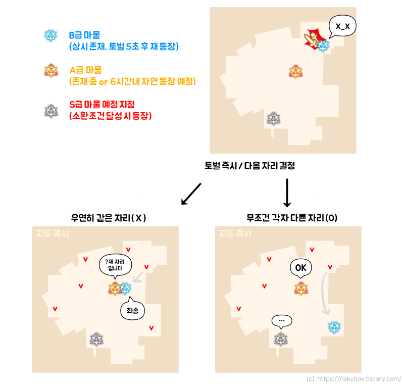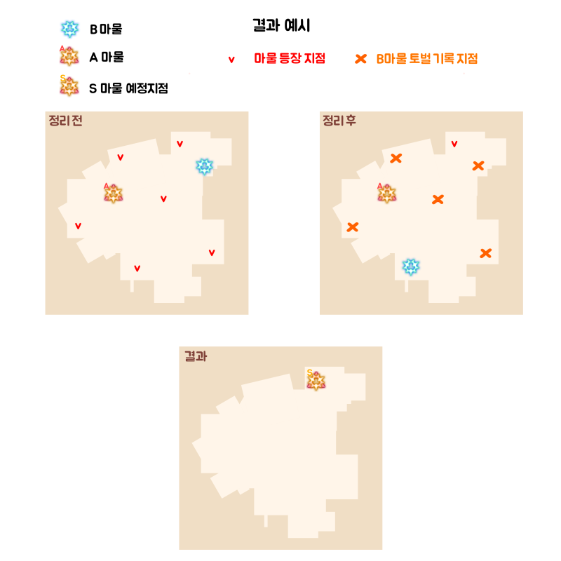 3. 마물은 자연 생성시간(B/A), 소환(S)과 관계없이 토벌 직후 바로 다음 등장 지점이 결정된다.